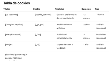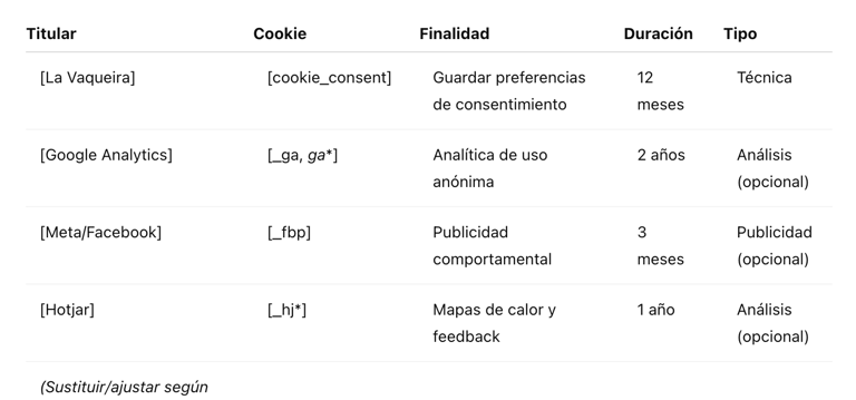 De publicidad comportamental (si se usan): almacenan información del comportamiento del usuario para mostrar publicidad personalizada. (Opcionales).